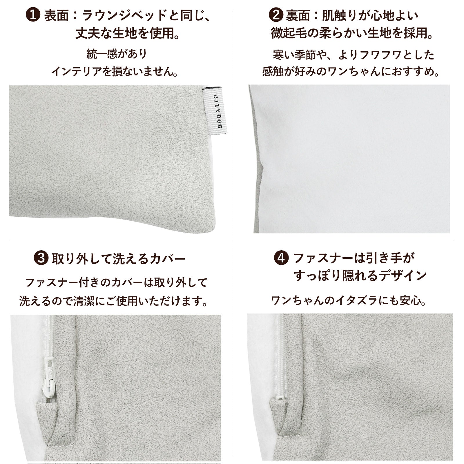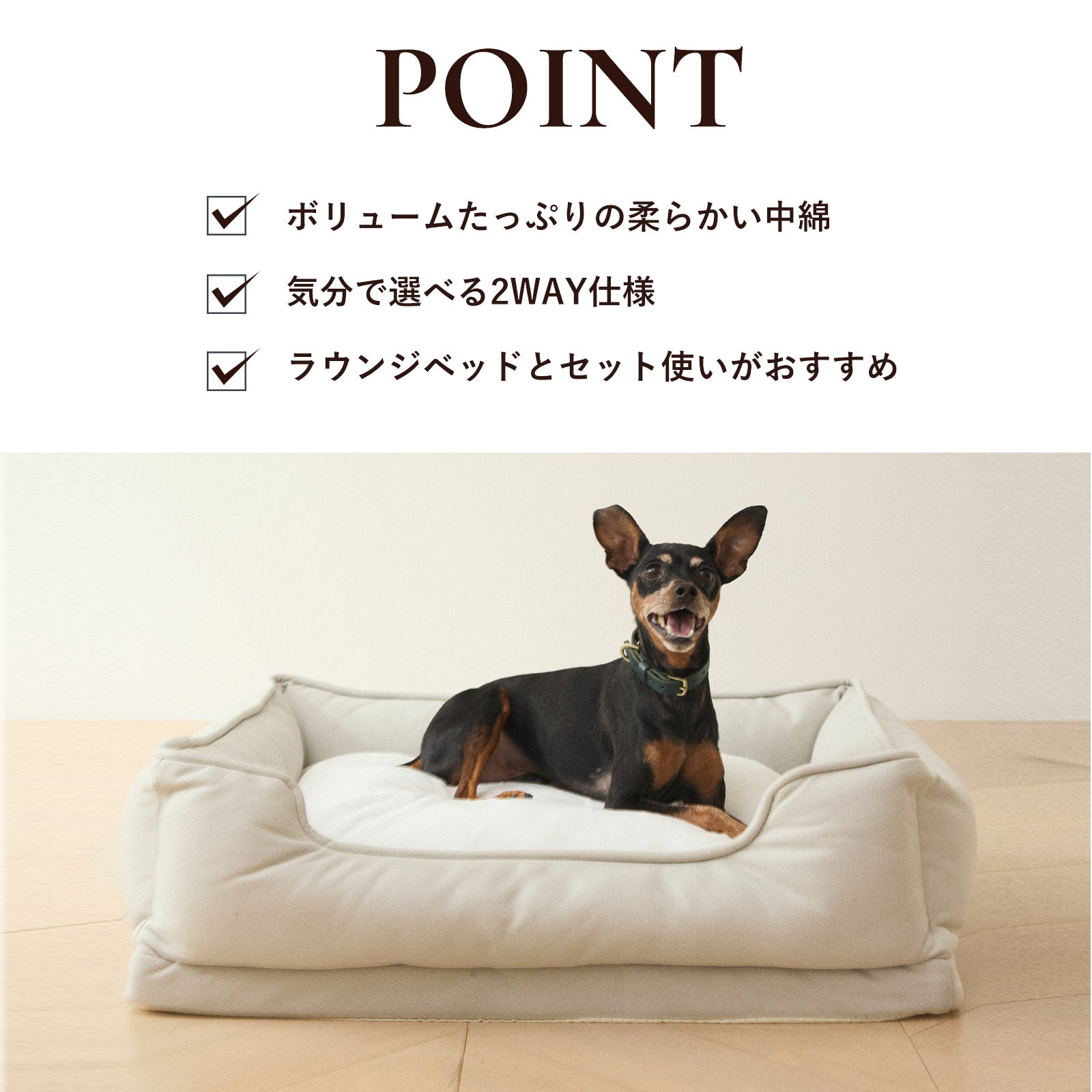 ラウンジベッドにすっぽりと収まるように設計されたサイズ感でもあり愛犬がいつでも安心して体を預けられるようなデザインです。